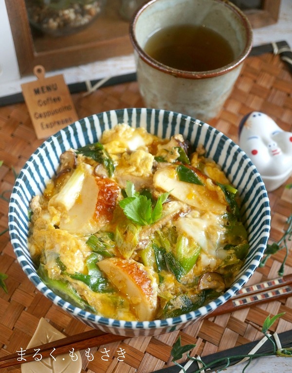 こちらはぱぱっと作れる『木の葉丼』を作りました。お肉の代わりにかまぼこや椎茸を入れ木の葉に見立てたものです。ふと思い出し作りたくなったのです···