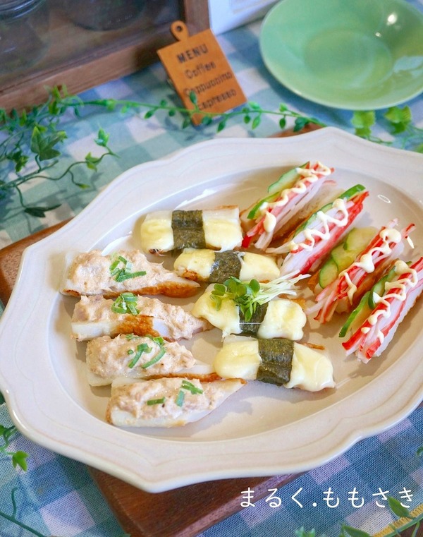 乗せるだけでおつまみに早変わり♪3種類のちくわボード(チーズ・カニカマ・ツナマヨ)